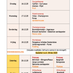 De soep is steeds vetarm. Mits aanvraag bij de thuiszorg kunnen alle maaltijden vet- en zoutarm gemaakt worden. Ook dieetmaaltijden kunnen na afspraak geregeld worden.