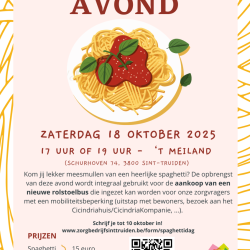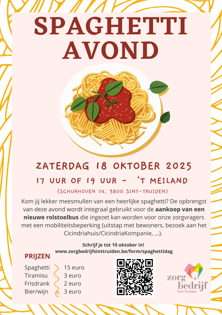 KruimelpadHome Spaghetti avond voor het goede doel Spaghetti avond voor het goede doelKom jij op 18 oktober meesmullen van een lekkere spaghetti voor het goede doel? Schrijf je snel in! https://www.zorgbedrijfsinttruiden.be/form/spaghettidag