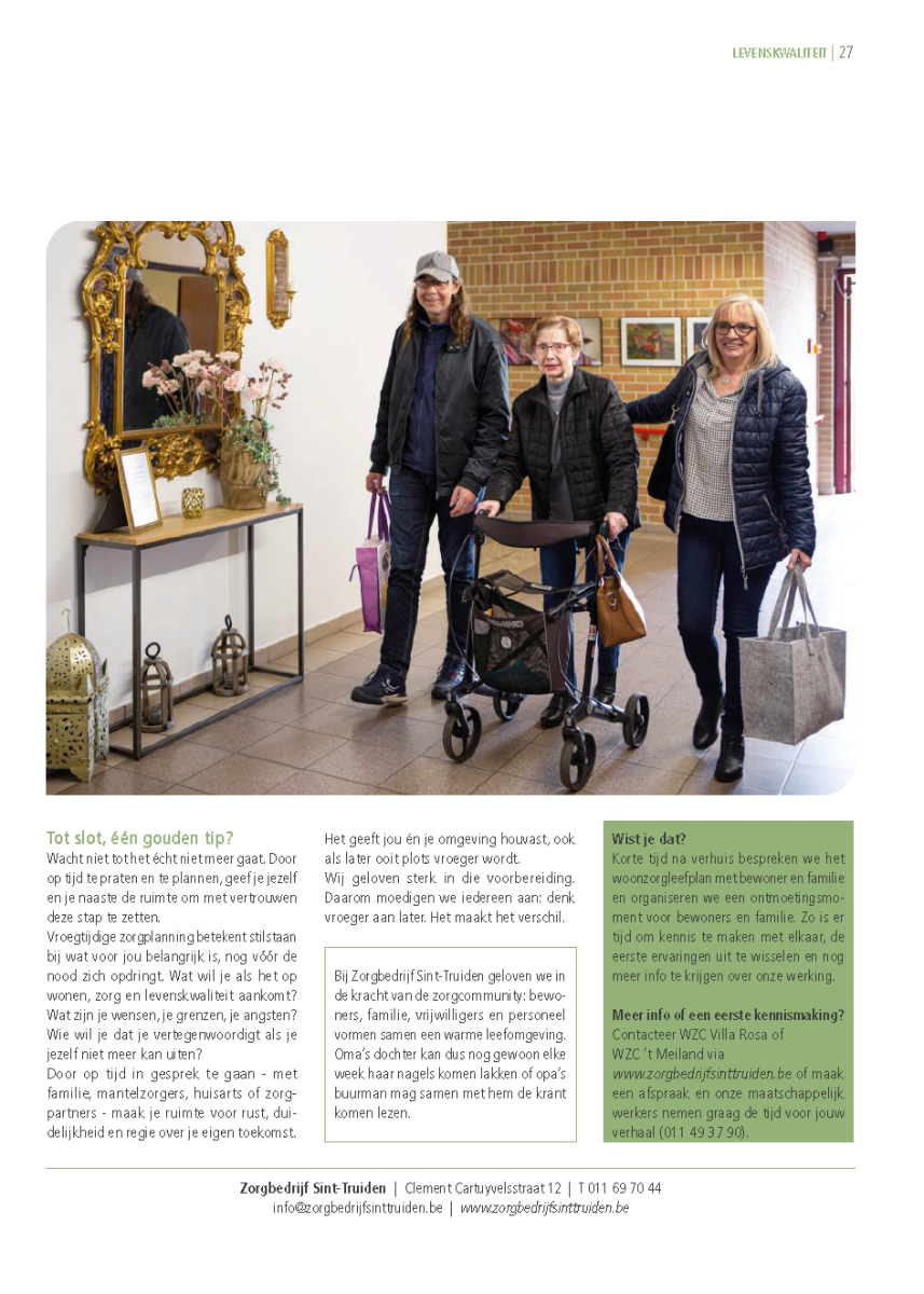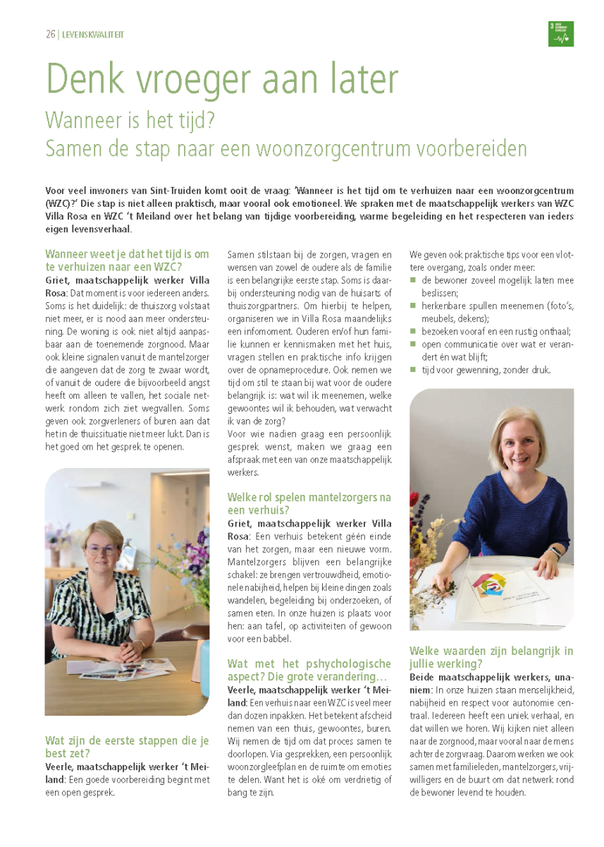 Wanneer is het tijd om de stap naar een woonzorgcentrum te overwegen? In de septembereditie van het Stadsmagazine Sint-Truiden delen onze maatschappelijk werkers tips en inzichten over een warme, goed voorbereide overgang.